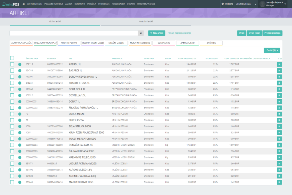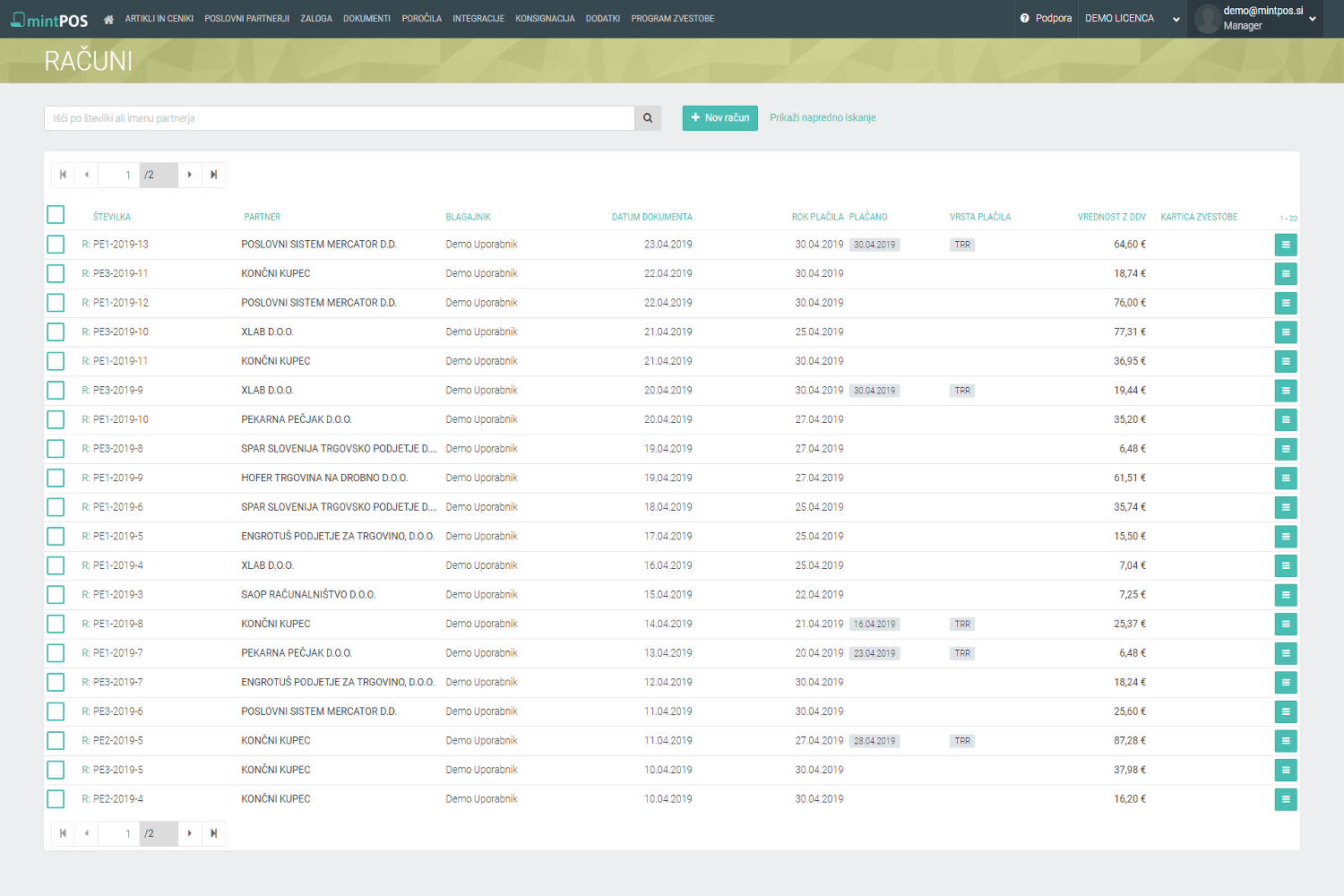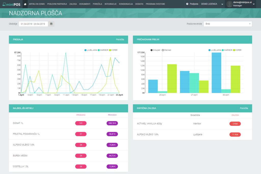 Različna poročila za vodenje vašega poslovanja | Vedno zakonsko ustrezen in nadgrajen program. Brez dodatnih stroškov. | MintPOS je brezplačen ponudnik poti za pošiljanje računov proračunskim uporabnikom. | Možnost davčnega potrjevanja tudi v spletni pisarni. Vnos in davčna potrditev računov iz VKR preko spletne pisarne (upoštevan promet, vodenje zalog, ...). |
